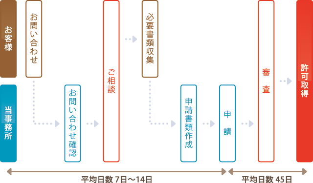 《お問い合わせ》から《許可取得》までの大まかな流れと、必要な平均日数です。